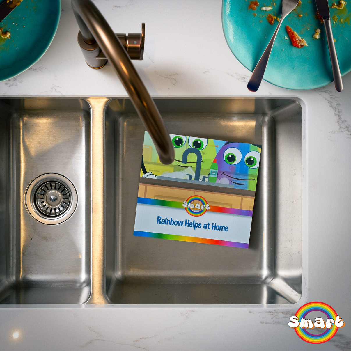 In "Rainbow Helps at Home," the morning routine turns unexpectedly as Rainbow and Daddy enjoy toast with jam, only for Daddy to realise the breakfast plates haven't been cleared. Taking this opportunity, Daddy explains the importance of cleaning up after oneself. Throughout the story, Rainbow learns valuable lessons about contributing at home, including washing up and recycling.
